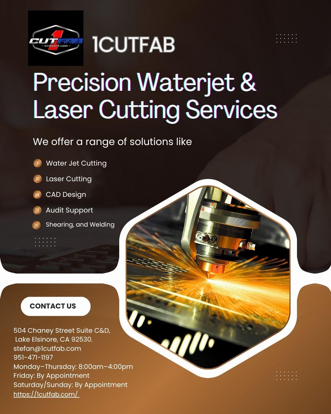 https://www.linkedin.com/company/1cutfabBusiness Name : 1CUTFAB About : 1CUTFAB specializes in high-quality precision fabrication services, combining advanced technologies to bring your ideas to life. At 1CUTFAB, we cater to industries from Achieving precise Waterjet Cutting on a variety of materials, including metals, glass, ceramics, and composites, with minimal waste. High-precision laser cutting and engraving for intricate designs and complex shapes. Rapid prototyping and production using cutting-edge 3D printing technology for customized, functional, and aesthetic parts. Website : https://1cutfab.com/ Address : 504 Chaney Street ste C&D, Lake Elsinore, CA Email : Stefan@1cutfab.com Phone No. : 951-471-1197 Working Hours : Monday-Thursday: 8:00am-4:00pm Friday: By Appointment Saturday/Sunday: By Appointment Social Media Accounts : https://www.facebook.com/1CUTFAB https://www.instagram.com/1cutfab/ https://1cutfab.com/blogs/news https://www.pinterest.com/1cutfab/ https://www.tiktok.com/@1cutfab https://x.com/1cutfab https://www.youtube.com/@1CUTFAB https://www.linkedin.com/company/1cutfab0 Comments 0 Shares 341 Views -