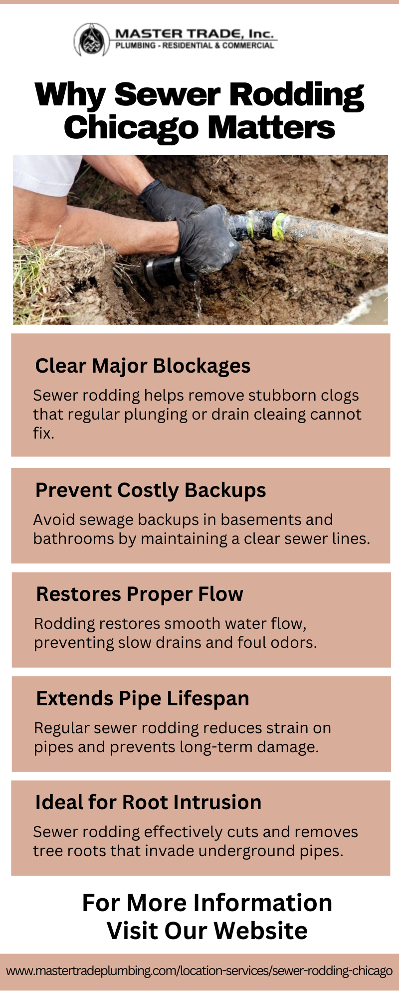 WWW.MASTERTRADEPLUMBING.COMSewer Pipe Repair Oak Park — Master Trade PlumbingTraditional rodding involves the use of a thin, flexible cable machine (such as Rigid or Spartan) to create an opening in the clogged drains or sewer pipes. While this allows water to flow through again, it is sometimes only a quick fix of bigger problems. In those cases, more specialized techniques0 Comments 0 Shares 260 Views -
