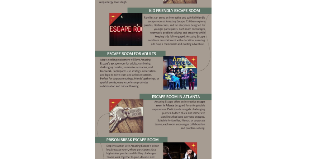Read More:- https://infogram.com/atlanta-escape-game-adventure-1hmr6g89p8mzz2nAtlanta Escape Game Adventure Amazing Escape delivers a full escape game adventure in Atlanta filled with puzzles, clues, and engaging storylines. Participants collaborate in teams to overcome challenges while developing problem-solving and communication skills. Designed for adults, families, and friends, each adventure provides immersive experiences that keep energy levels high. Read More:- https://infogram.com/atlanta-escape-game-adventure-1hmr6g89p8mzz2n