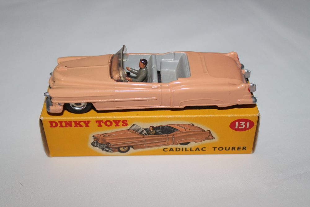 This is a harder to find variation sought after late issue Cadillac Eldorado in flesh with a grey interior and civilian driver. Later features are the silver shaped spun hubs and black grip tyres with a black smooth shiny 131 base plate. Tail lights are also displayed. Click here: https://diecastgems.com/