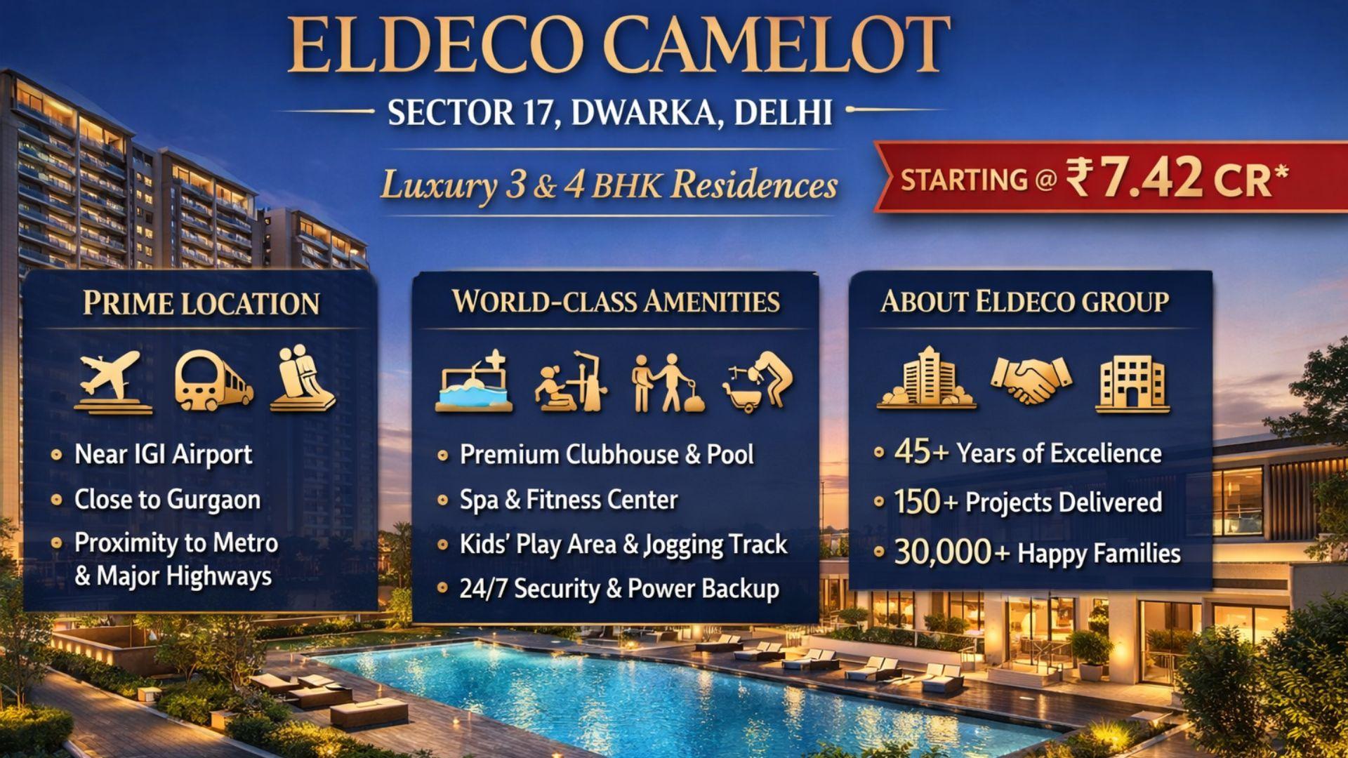 Eldeco Camelot at Sector 17 Dwarka brings spacious 3 & 4 BHK luxury residences crafted by a trusted developer, set in one of the most well-planned neighbourhoods in Delhi. From seamless airport connectivity to premium lifestyle amenities, this is where comfort meets long-term value.
