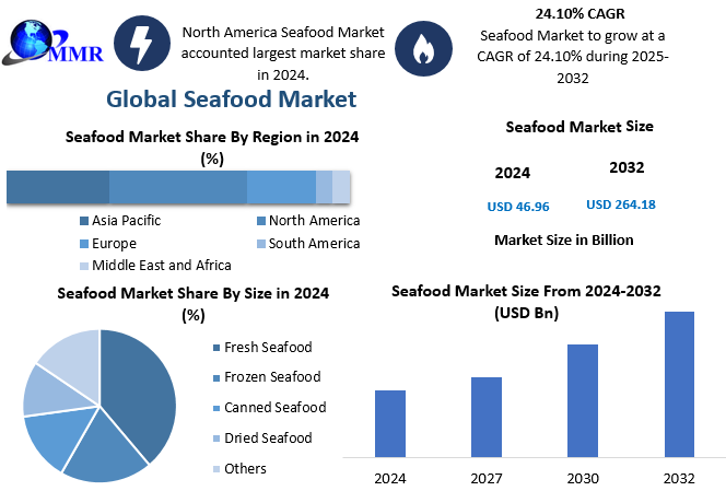 The Seafood Market was valued at approximately USD 46.96 billion in 2024 and is projected to reach nearly USD 264.18 billion by 2032, growing at a robust compound annual growth rate (CAGR) of 24.10%. This market encompasses the production, processing, and distribution of various seafood products, including fish, shellfish, and other marine organisms, catering to both domestic and international markets.