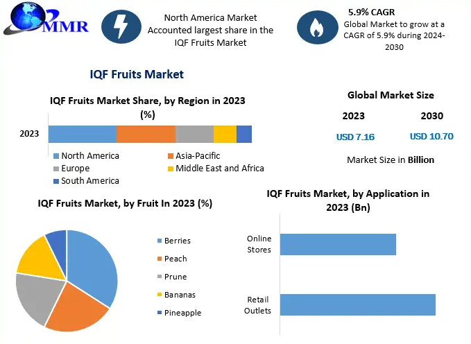 The global IQF fruits market was valued at approximately USD 7.16 billion in 2023 and is projected to reach USD 10.70 billion by 2030, growing at a compound annual growth rate (CAGR) of 5.9% during the forecast period. This growth is attributed to the rising preference for ready-to-eat, healthy food options that require minimal preparation time.