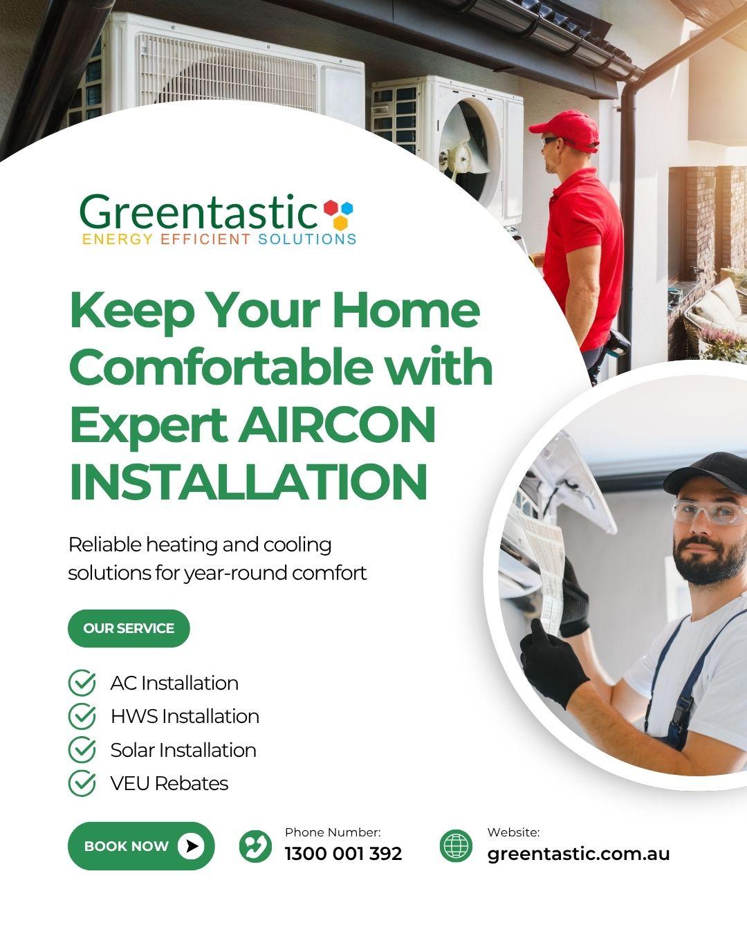 From aircon installation to hot water systems, solar, and VEU rebates, Greentastic has you covered with reliable, energy-efficient solutions.