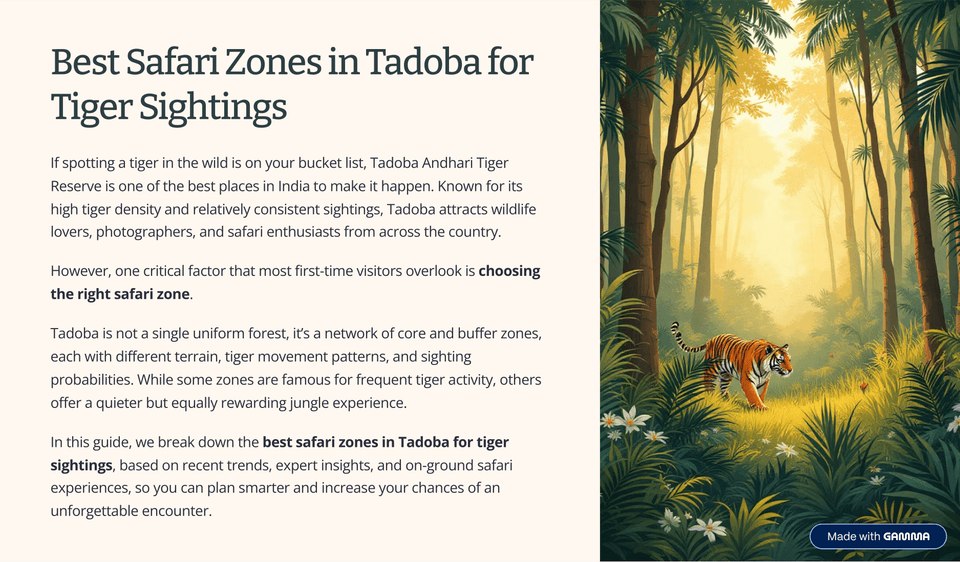 Tadoba is one of the top wildlife destinations in India, especially known for its tiger population. To increase your chances of spotting a tiger, choosing the right safari zone is very important. Popular zones like Moharli, Kolara, and Navegaon are well-known for frequent tiger sightings and rich forest landscapes. Each zone offers a unique experience, whether you prefer a peaceful jungle safari or a more active wildlife encounter. Understanding the best safari zones in Tadoba for tiger sightings helps you plan your trip better and makes your safari more exciting, enjoyable, and memorable for both first-time visitors and wildlife lovers.